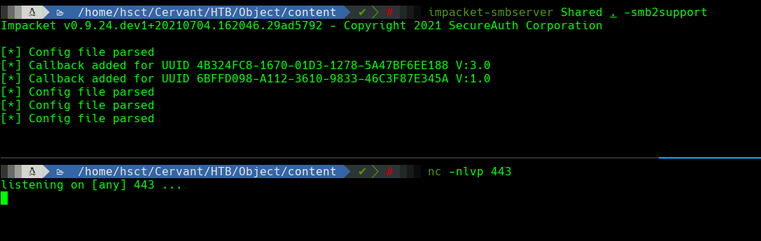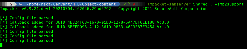 Esto nos indica que hay alguna regla en el Firewall de la máquina Object que impide conexiones salientes, ya que en ningún momento se recibió una petición hacia el smbserver.