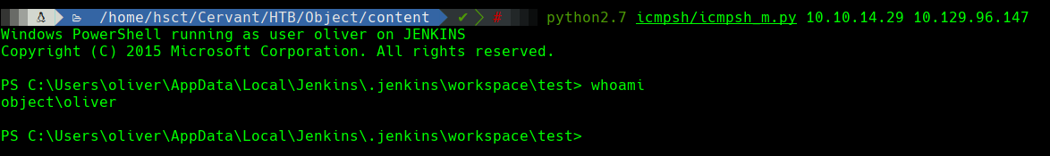 Tenemos ejecución remota de comandos (RCE) con el usuario object\oliver, en este momento podemos intentar obtener una reverse shell para entrar a la máquina.