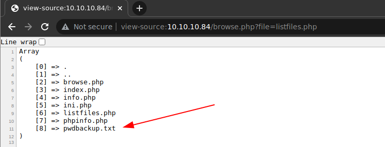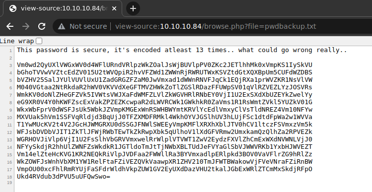 este archivo, como dice su propio nombre, listará todos los archivos del directorio actual y acá es donde se ve un recurso de interés: pwdbackup.txt. Al leerlo se verá que contiene una contraseña cifrada posiblemente en base64 y al menos 13 veces como indica el texto.