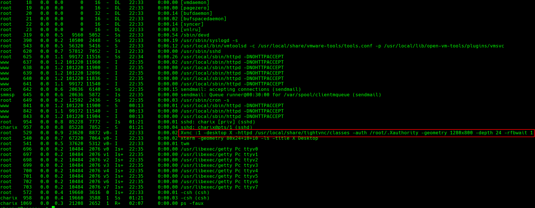 Al parecer hay un servicio de VNC corriendo con el usuario root. Esta es una vía potencial para escalar privilegios si se pudiera entrar a la sesión de VNC activa, el problema es que el puerto 5901/tcp para la conexión a VNC está cerrado desde la máquina víctima.