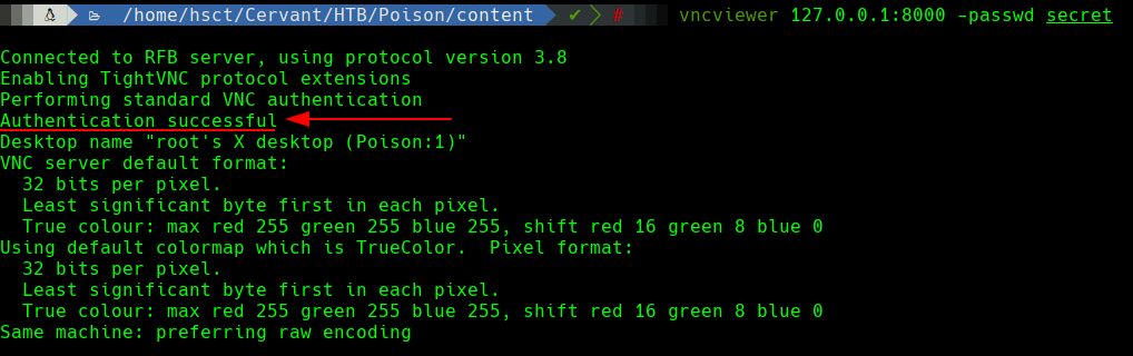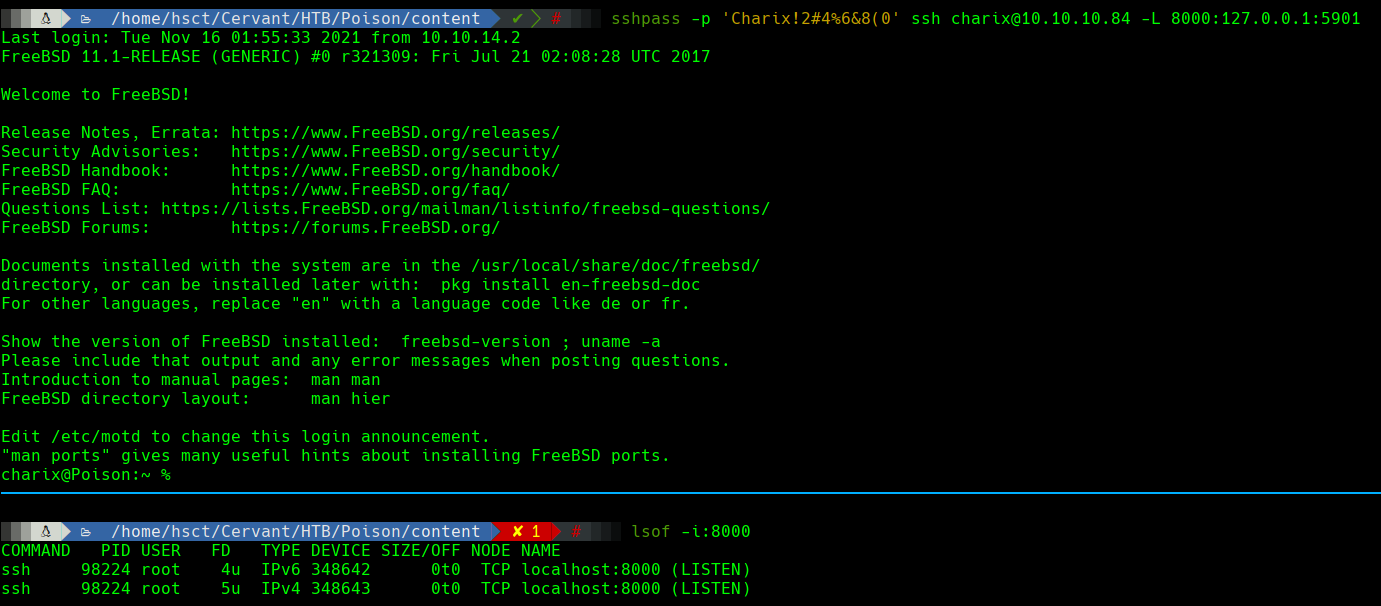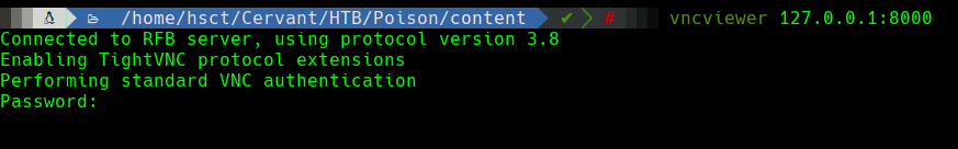 En este caso, se realizará un forwarding del puerto 5901(VNC) de la máquina Poison, hacia el puerto 8000 de la máquina local. De manera que cuando se consulte el puerto 8000 localmente, este tráfico llegará a Poison con el puerto 5901